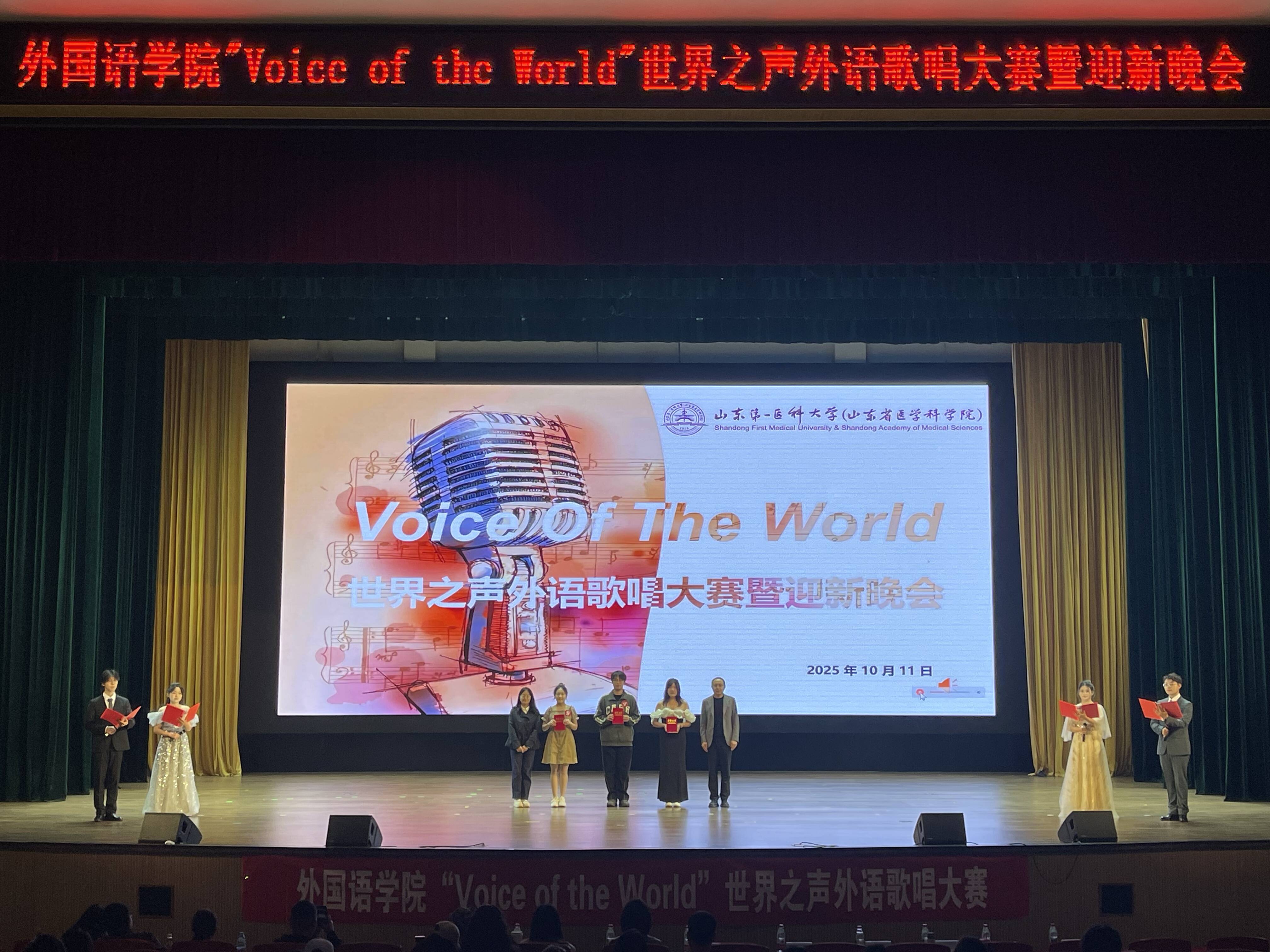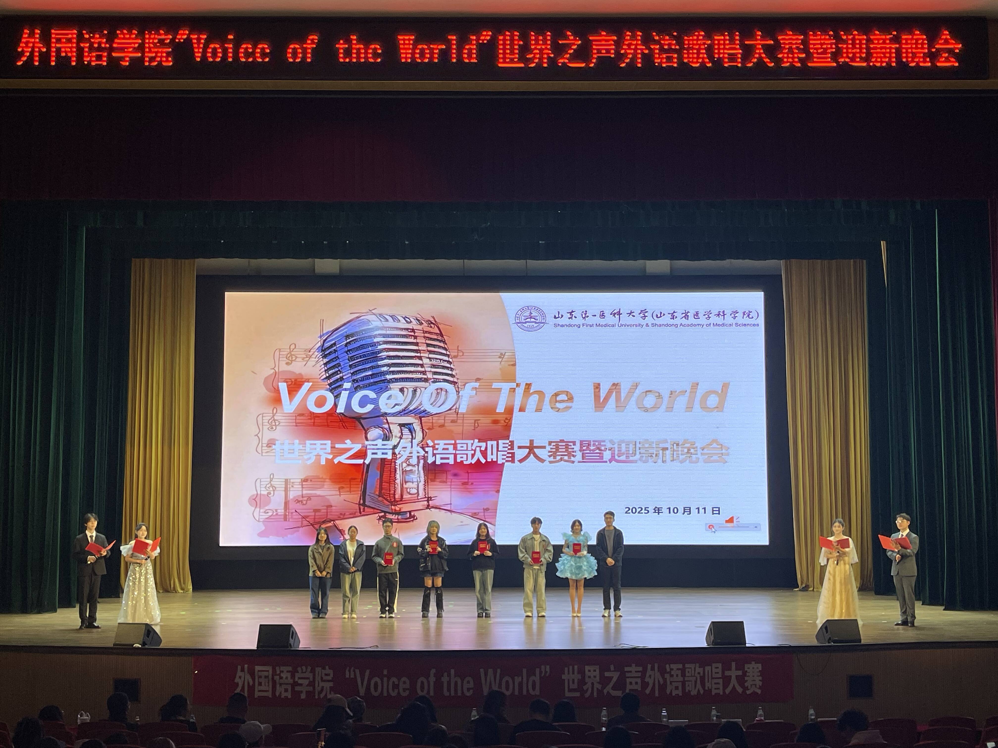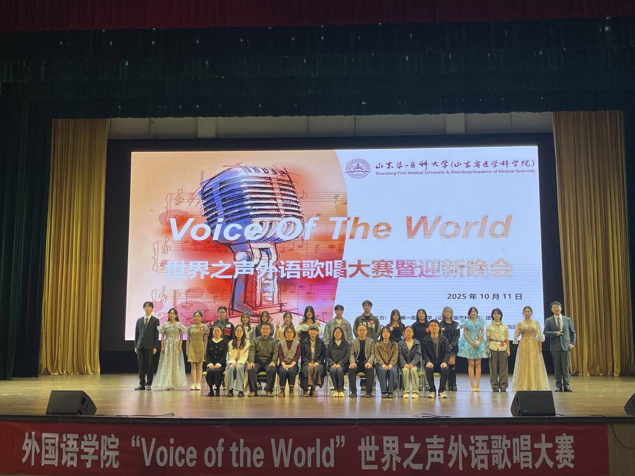 为丰富校园文化生活,营造外语学习氛围,10月11日晚,山东第一医科大学“Voice of the World ”世界之声歌唱大赛暨外国语学院迎新晚会在大学生活动中心成功举办。本次大赛由校(院)团委主办、外国语学院团委承办,并邀请校(院)团委、各学院教师担任评委,各学院辅导员代表和2025级学生代表到场观赛。
