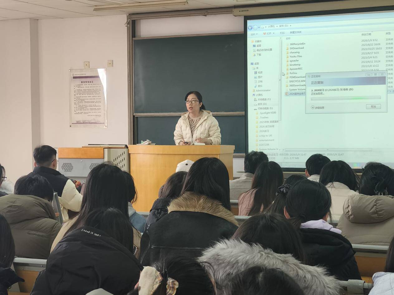 为扎实做好2026届毕业生实习与论文工作衔接,引导学生明确职业方向,外国语学院于1月9日在B6001教室举行2026届毕业实习动员大会。教学副院长杜伟、英语系主任张勇、翻译系主任那明出席大会,会议由学工办主任宋雪主持。