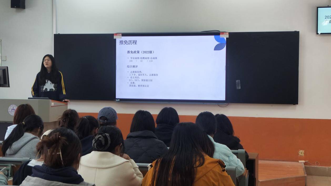 分享会上,三位同学结合自身推免经历,从推免流程、院校选择、材料准备及面试技巧等方面展开详细讲解。其中,上岸中国海洋大学外国语言文学专业的宋欣悦分享了备考策略与时间规划,全方位剖析了保研中学校的投递和选择,为同学们指点迷津。上岸北京语言大学 外国语言学及应用语言学专业的武子暄围绕专业方向选择与心态的调整提出中肯建议;王文赜则讲述了推免至山东师范大学英语语言文学专业的心得体会,为同学们提供了切实可行的参考。同时,她们都提到,成绩的提升不在一朝一夕,而是体现在日积月累之上。有保研想法的同学,需要付出异于常人的努力,提前做准备,功夫下在平时,注重自身素质培养。