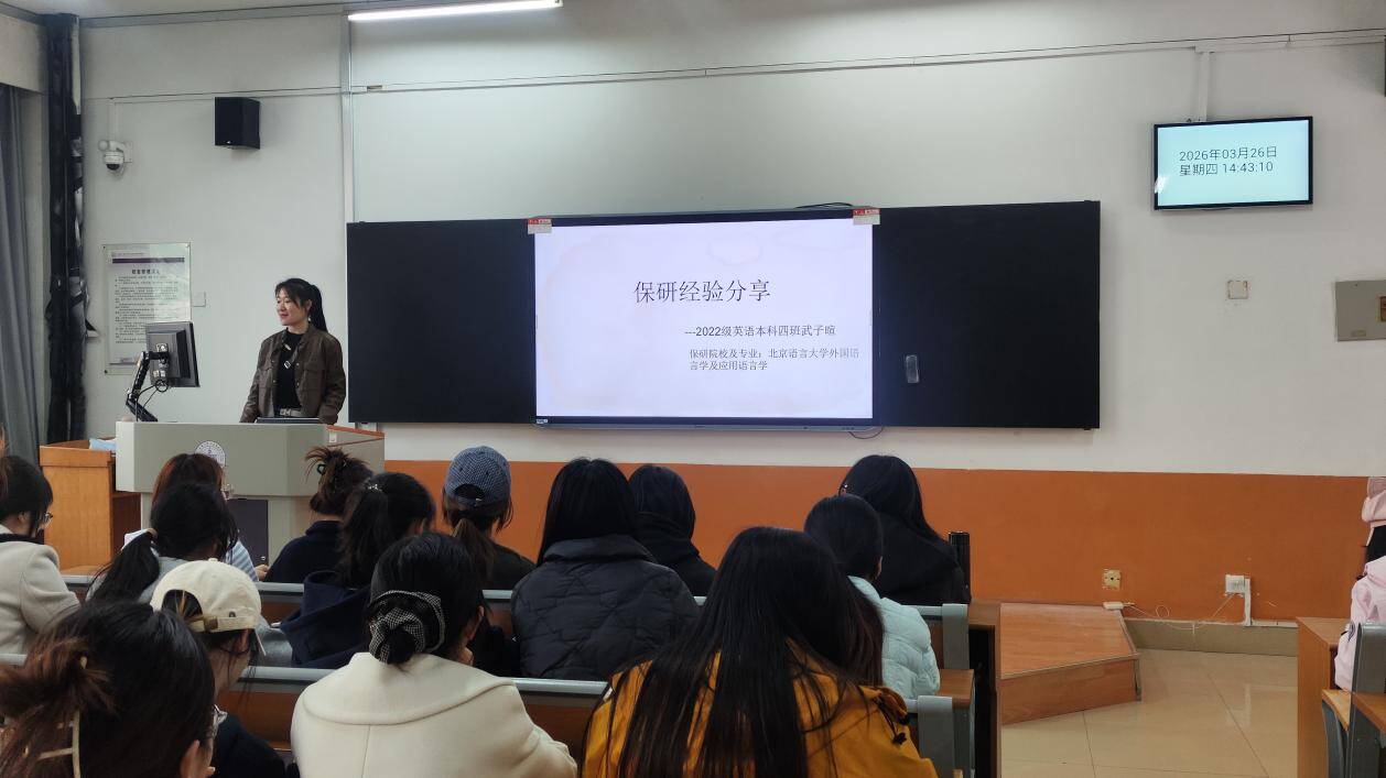 为了传递榜样力量,弘扬优秀学风,帮助广大学生深入了解保研流程,掌握保研技巧。2026年3月26日下午,外国语学院在教学北楼A1009教室举办“以语为翼,逐梦研途”保研专场优秀学生事迹宣讲会。活动邀请三名成功保研的学子分享保研经验和学习方法。宣讲会由学工办主任宋雪主持。
