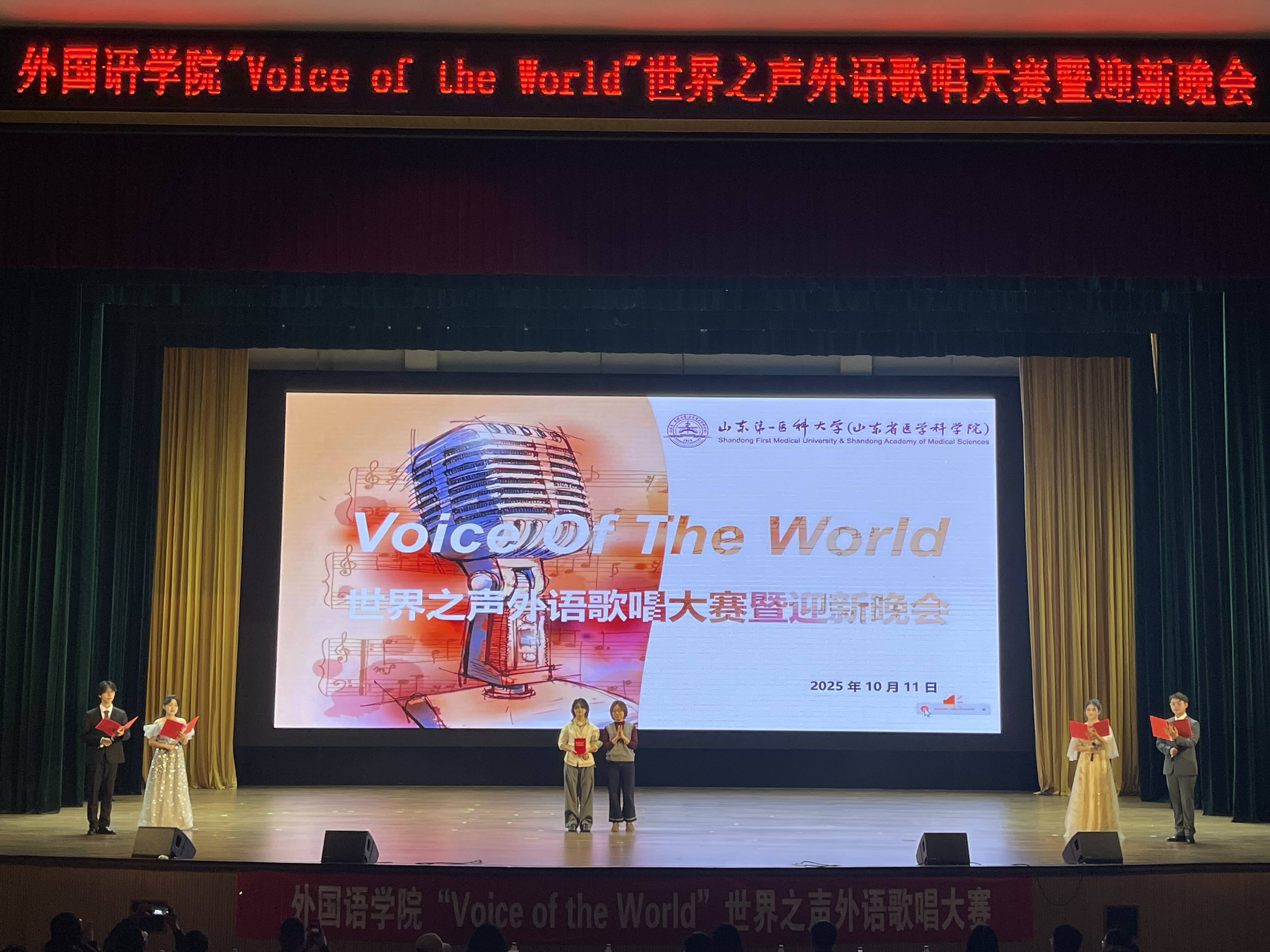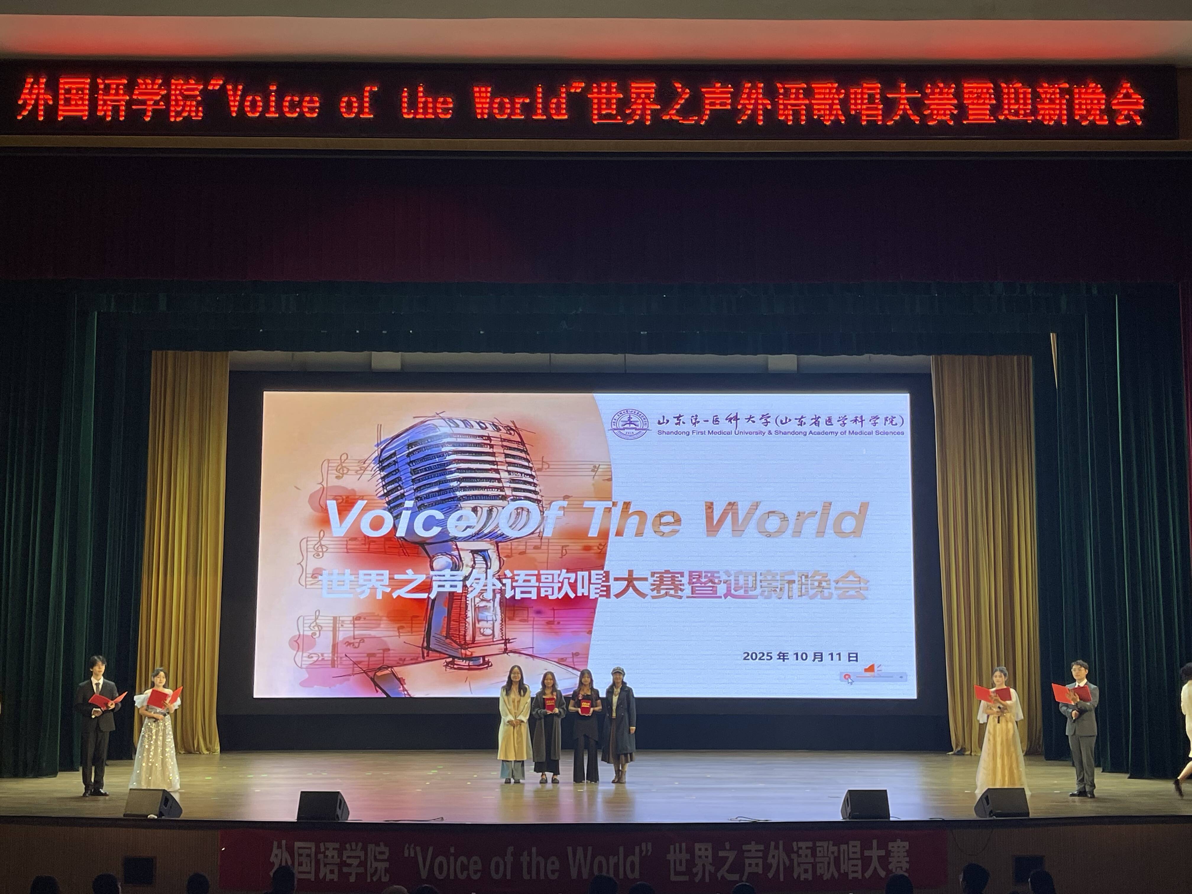 为丰富校园文化生活,营造外语学习氛围,10月11日晚,山东第一医科大学“Voice of the World ”世界之声歌唱大赛暨外国语学院迎新晚会在大学生活动中心成功举办。本次大赛由校(院)团委主办、外国语学院团委承办,并邀请校(院)团委、各学院教师担任评委,各学院辅导员代表和2025级学生代表到场观赛。