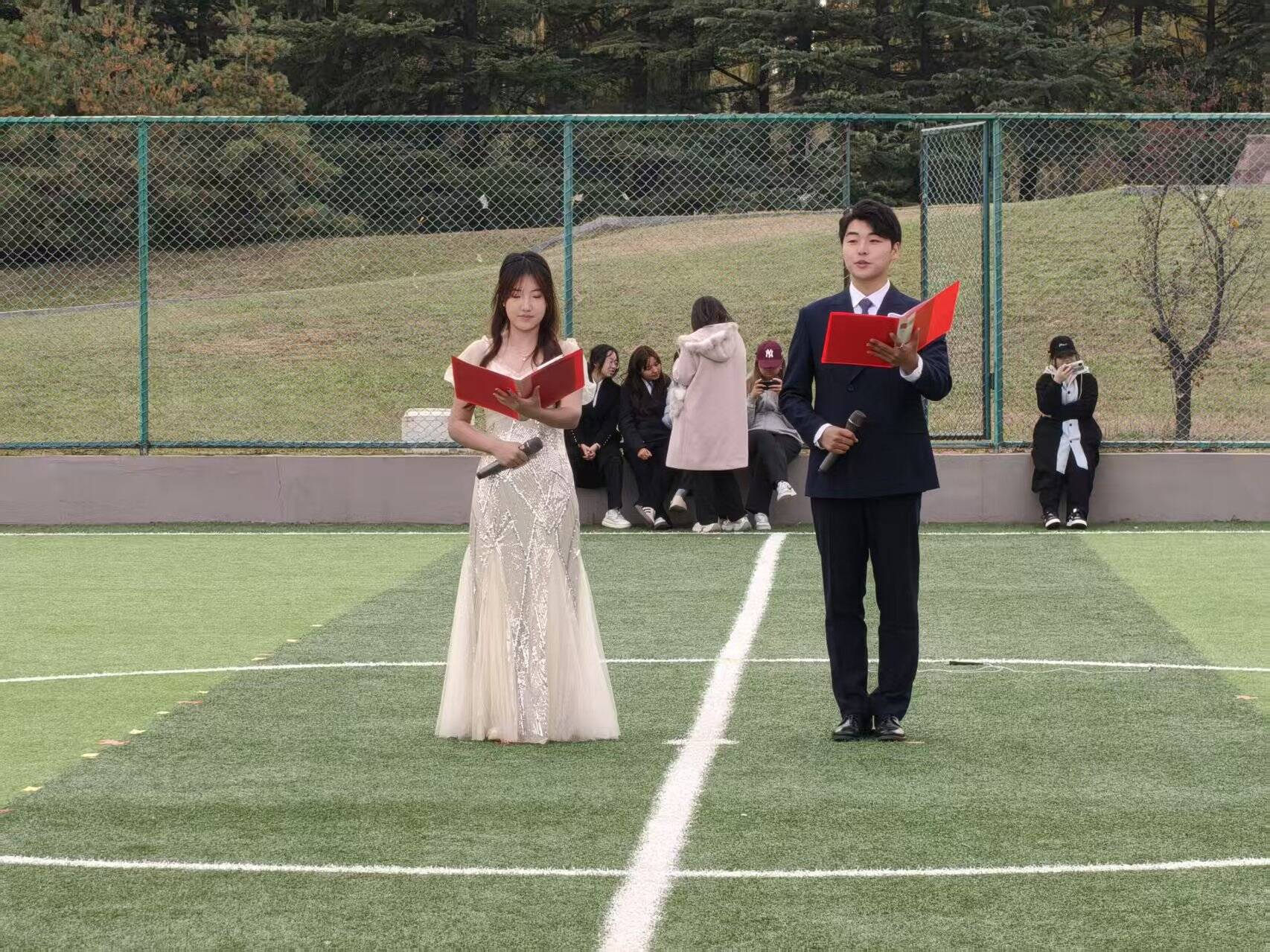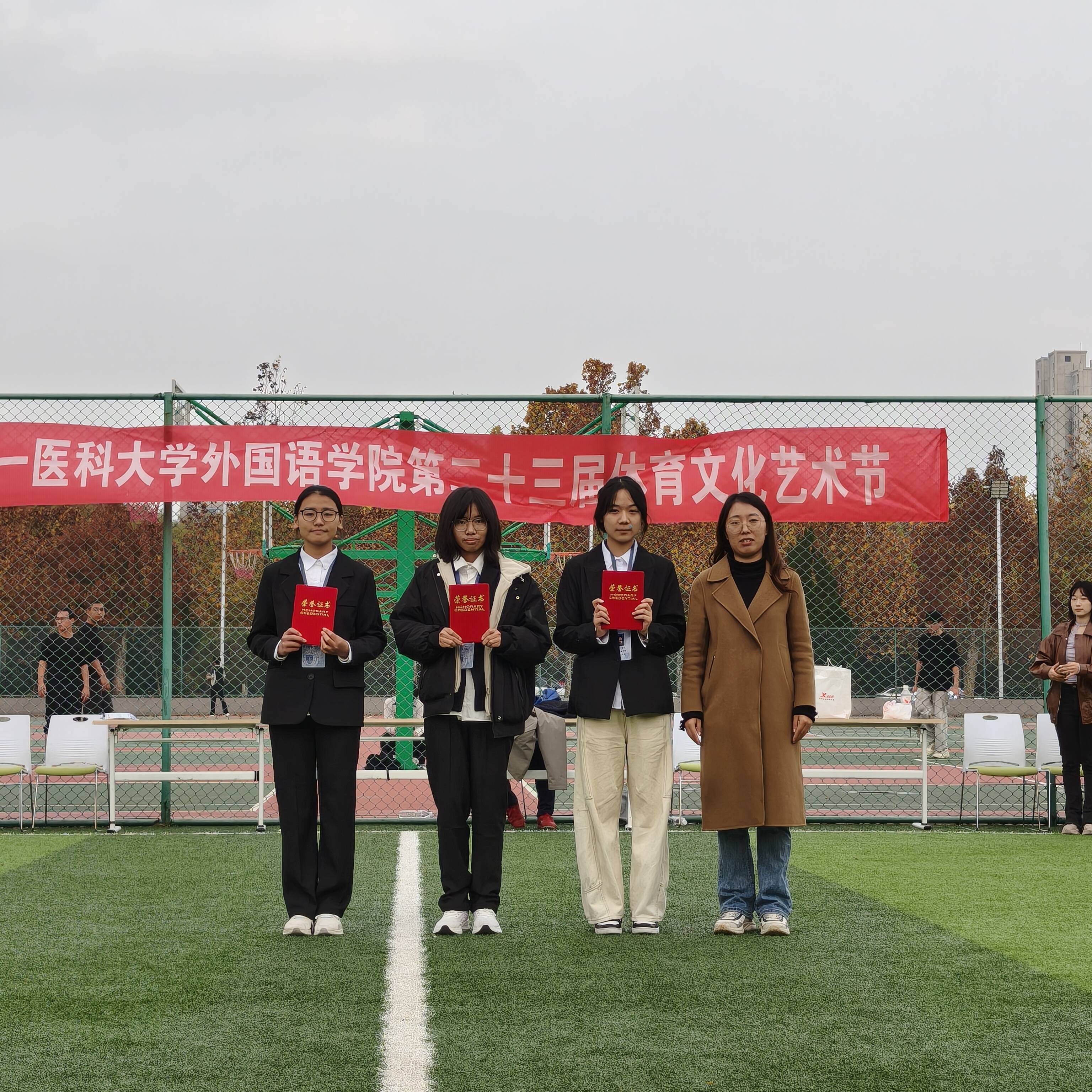 随后,颁奖仪式有序开展。学院老师为获奖班级代表颁发荣誉证书与奖品,这既是对获奖队伍的祝贺,也是对所有参赛同学努力的肯定。文艺部同学的登台献唱,让悠扬歌声在运动场上回荡,这不仅为赛事画上温馨句号,也让现场紧张的竞技氛围逐渐转为轻松愉悦,师生们伴着旋律轻轻哼唱,共同享受活动尾声的美好时刻。